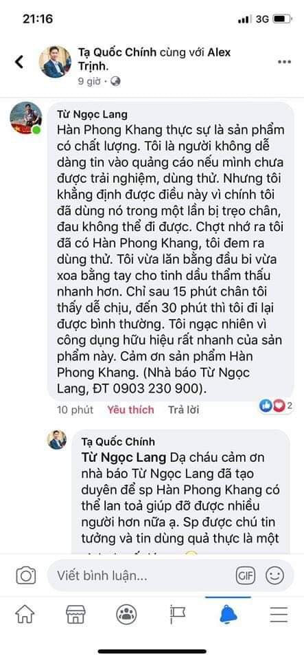 Tôi thấy quảng cáo hàn phong khang và bấm vào, thấy sản phẩm rất hay vì nó là dạng tinh dầu lăn mà lại có cả mát xa . Cũng quyết định mua về dùng thử. Về dùng thấy hiệu quả bất ngờ. Lúc đau nhức người ê ẩm mà mệt mỏi cứ lấy ra dùng là dịu nhẹ hẳn người. Không còn ê ẩm đau đầu gối nữa